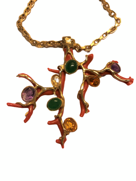 oro giallo, corallo rosso, smeraldi cabochon, ametiste e quarzi citrini
